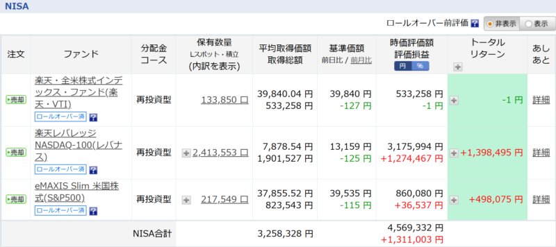 大きくマイナスだった楽天レバナスも、プラスに転じたね。