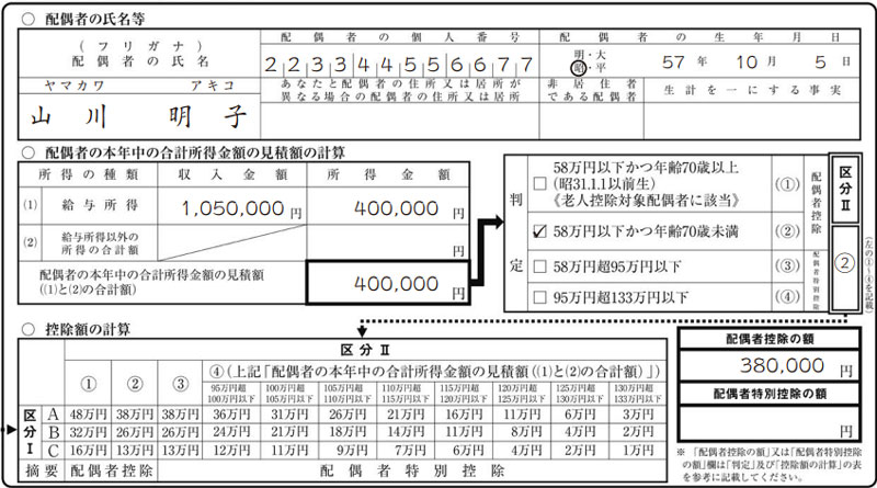 上の例では、「配偶者控除の額」欄に380,000円(「判定」欄の番号が①又は②であれば配偶者控除、これらの番号以外の番号であれば配偶者特別控除)