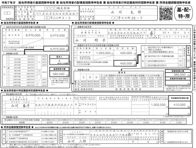 よく見ると、左に給与所得者の基礎控除申告書(年末調整に係る定額減税のための申告書を含む。)、右に給与所得者の配偶者控除等申告書、下に給与所得者の特定親族特別控除申告書と所得金額調整控除申告書の欄となっているんだよね。