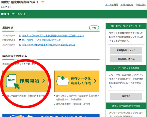確定申告書等作成コーナーのトップページが表示されました。続けて、作成が初めてであれば、「作成開始」をクリック。なお、既に確定申告書の作成を始めていて、一時中断をしていたなら、隣の「保存データを利用して作成」を選んで保存データを読み込むと、途中から再開することができます。