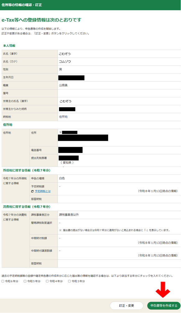 ここから先は、申告に当たって必要な個人情報、マイナンバー、提出年月日等を入力します。