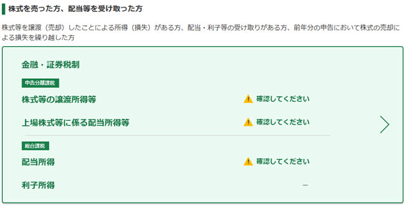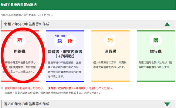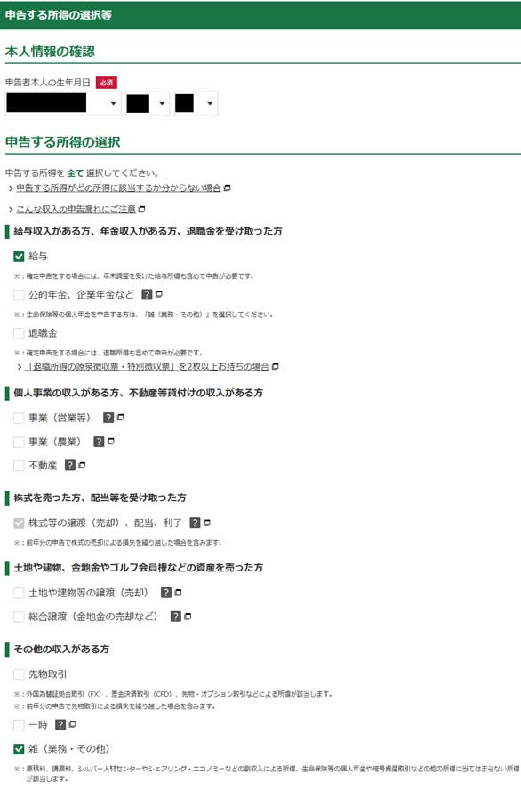 申告する所得の選択をします。