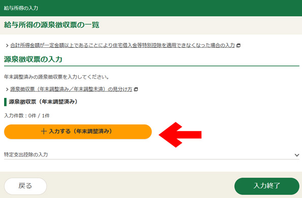 源泉徴収票が2枚以上ある場合は、こちらの画面の「+入力する(年末調整未済)」をクリックして同様に2枚目以降の源泉徴収票を見ながら入力してください。