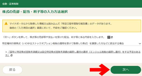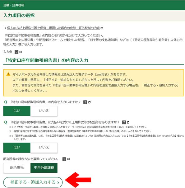 特定口座での取引、特定口座で支払を受けた配当金等及び課税方法(総合課税又は申告分離課税)を選び、最後に「入力する」をクリックしてください。