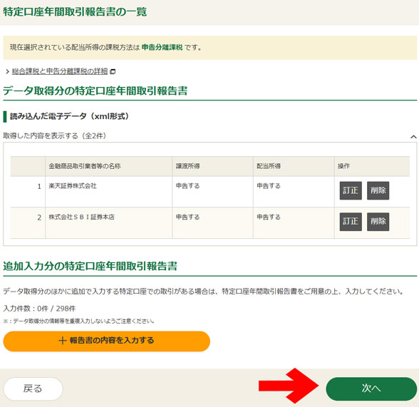 「特定口座年間取引報告書データの内訳」と「申告する所得の選択」については、初期状態で全て✅が付いたままでOK。