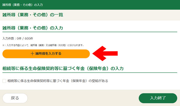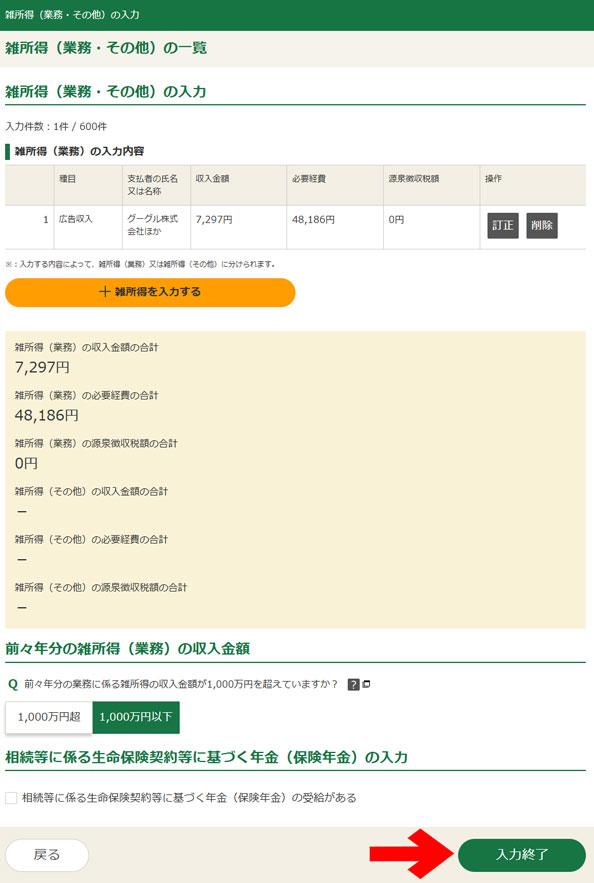 入力確認後、「前々年分の雑所得(業務)の収入金額」と「相続等に係る生命保険契約等に基づく年金(保険年金)の入力」をして、右下の「入力終了」をクリック