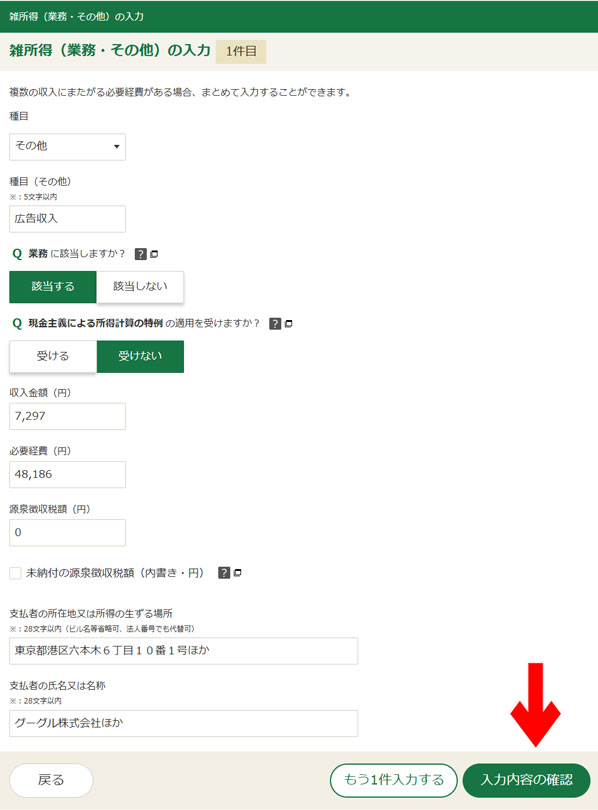 あとは、入力内容を確認。ほかにも雑所得があれば、「+雑所得を入力する」で申告してください。