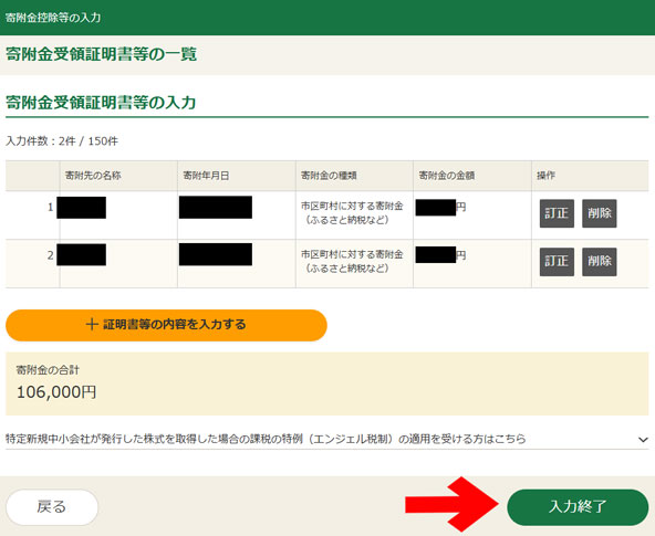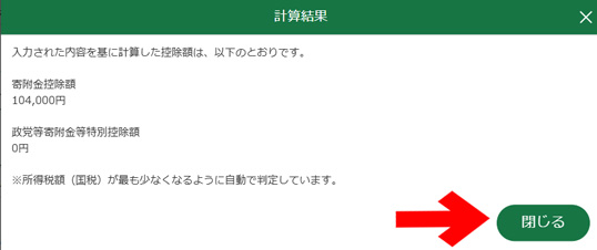 寄附金額は106,000円で、寄附金税額控除額は104,000円ということは、自己負担は2,000円。想定どおりだね!