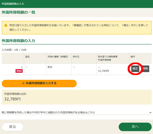 いよいよ外国税額控除の申告です。XMLデータを読み込む画面で読み込んでいるので、「補正」をクリック