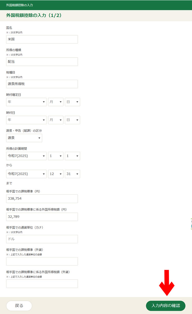 「外国税額控除の入力(2/2)」について記入した内容は、次のとおりです。