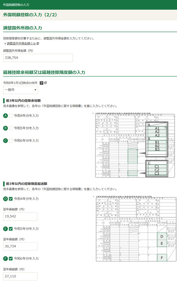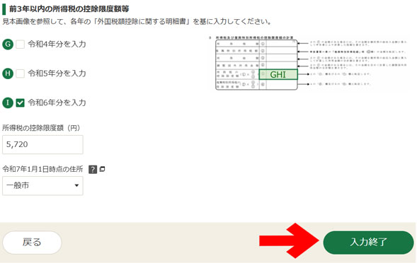 | 前3年以内の所得税の控除限度額等 | Iは5,720円、 令和7年1月1日現在の住所は一般市 | 過去の確定申告で提出した外国税額控除に関する明細書の「3 所得税及び復興特別所得税の控除限度額の計算」の「所得税の控除限度額⑤」に記載がないため。 |
