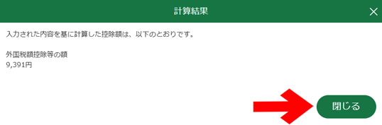 外国税額控除等の欄を確認し、「閉じる」をクリックして終了です。