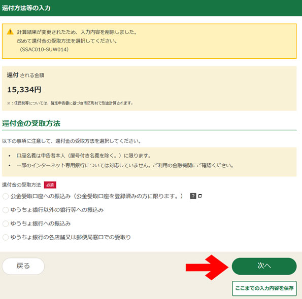 還付方法等の入力に移ります。私は、公金受取口座を選択しました。